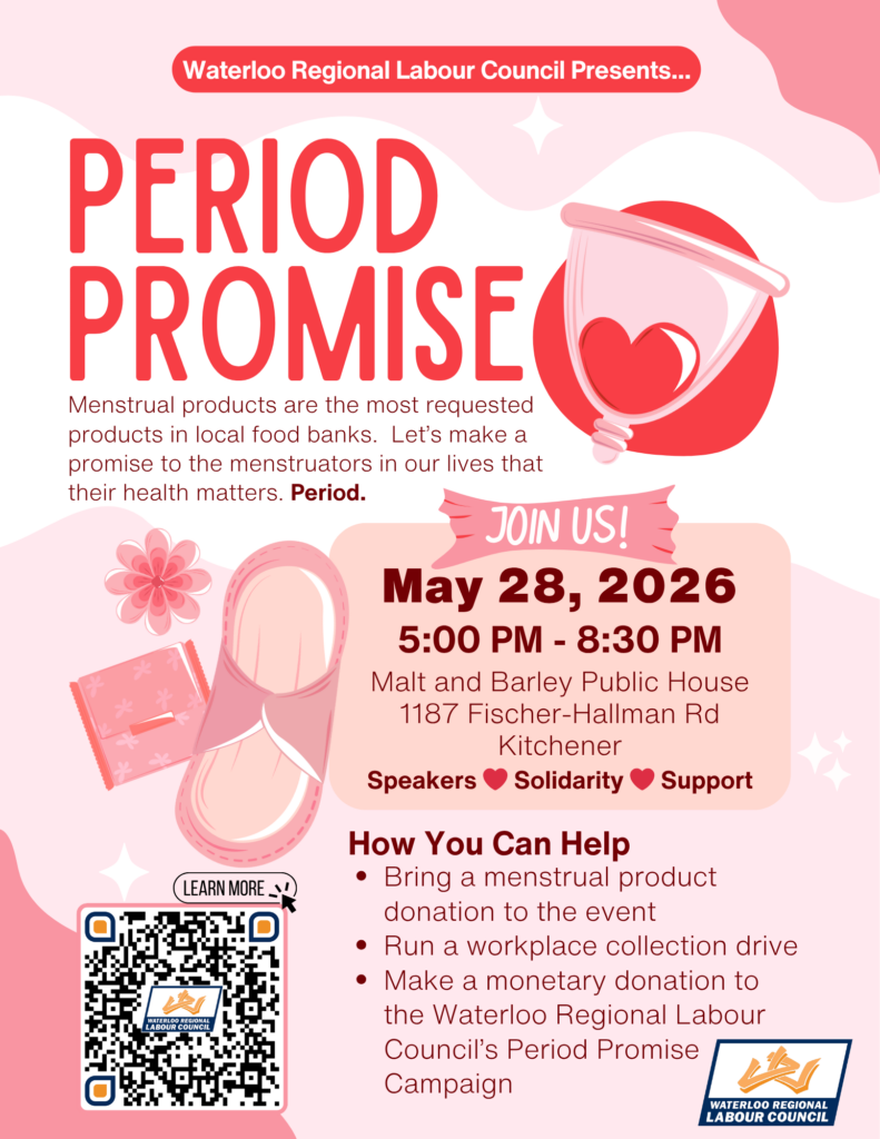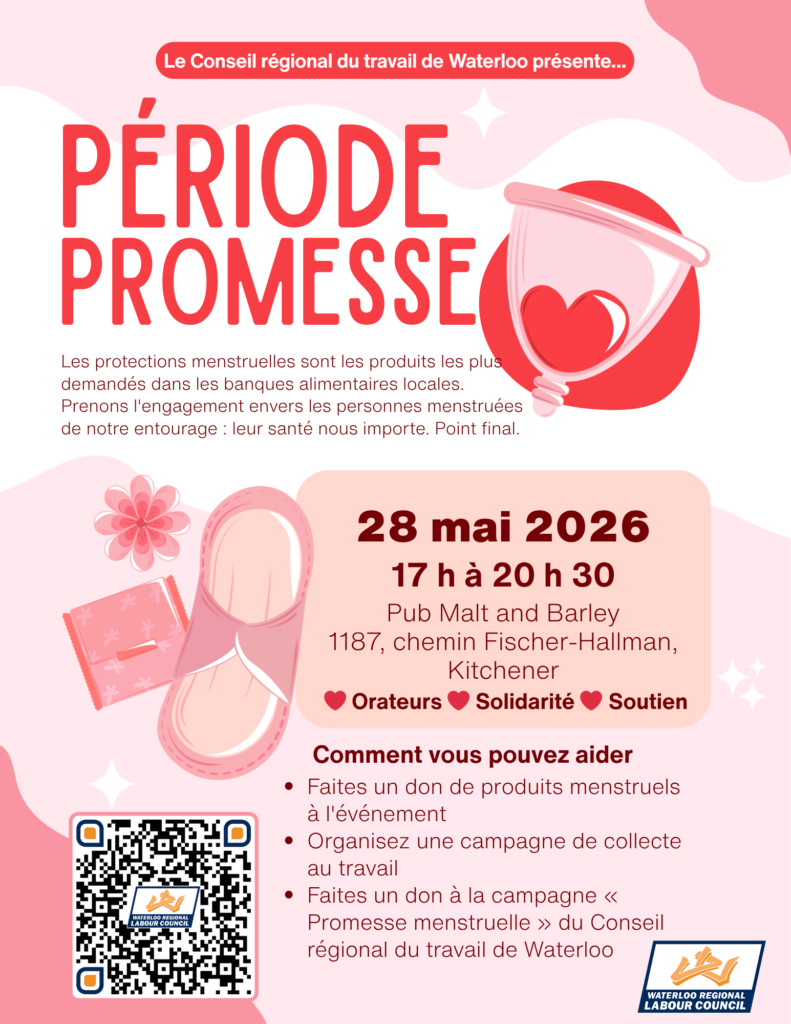 La précarité menstruelle et la stigmatisation ne devraient arrêter personne. Le jeudi 28 mai, joignez-vous à nous au Malt and Barley à Kitchener pour célébrer la Journée mondiale de l’hygiène menstruelle. Nous nous réunissons pour sensibiliser le public, soutenir nos voisins et approvisionner les banques alimentaires locales. Détails de l’événement : Il s’agit d’une rencontre informelle et ouverte à tous, conçue pour renforcer les liens communautaires et avoir un impact concret dans la région de Waterloo.